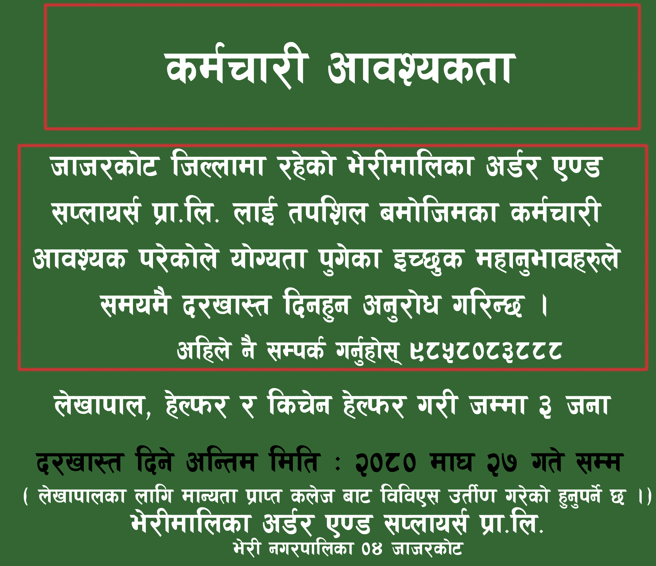 बार एसोसिएशन जाजरकोटको अध्यक्षमा अधिवक्ता भीमबहादुर सिंह कर्मचारी आवश्यकता जब कर्णालीको मुख्यमन्त्री जाजरकोटका प्रेम बने बारेकोटमा बन्यो अहिलेसम्मकै लामो झुलुङ्गे पुल जाजरकोटको खारा र मनघाटमा तत्काल बेलिब्रिज बन्ने, तीन महिनामा पुल बनाउन मन्त्री सिंहको निर्देशन मलेशियाको लागि फ्री भिजा, फ्री टिकेट, भूकम्प पीडित यूवामा खुशीयाली ! प्रेस चौतारी जाजरकोटले बिरामीलाई फलफूल दिएर मनायो स्थापना दिवस सहर बनाउन जग्गा एकीकरण जुम्लामा हिमपात, जनजीवन प्रभावित भेरीको मेयर कपको उपाधी शिव शंकर मावि जगतिपुरलाई Posts pagination Previous 1 … 72 73 74 … 689 Next